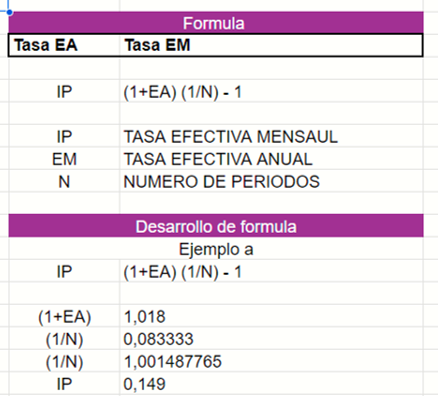 - Teniendo los datos iniciales, la tasa de interés efectiva mensual es de 1,49%, esta conversión es muy sencilla y se hace a través de la fórmula que puedes encontrar en la plantilla.